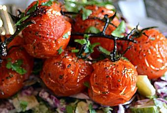 Cabbage cabbage...seems to be the forgotten 'stepsister' of the more elegant salad greens! But not so in my ally boho world...to me cabbage is gorgeous, and even more stunning and tasty in its natural state. Oh, yes, we can cook, steam, fry it, make cabbage rolls (which I love because my Croatian mom made the best 'sarma' out there~~I'm working on that recipe, too!)and cole slaw and more. But, I love to showcase cabbage in all its glory with this purple cabbage salad & roasted tomatoes!