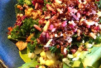 Cook quinoa and let it cool. In a mixing bowl, add quinoa, garbanzo beans (or rice), feta, cranberries and finely chopped kale. In a small bowl make the dressing — combine olive oil, honey, lemon, garlic, tamari and stir well. Pour dressing into the quinoa mixture and toss well to coat. Serve over greens! Optional: Add 1-2 tsp toasted pine nuts or crust walnuts. Scoop us a cup of the quinoa salad and serve over 1-2 cups of greens (i.e.: Romaine or mixed greens). ENJOY!