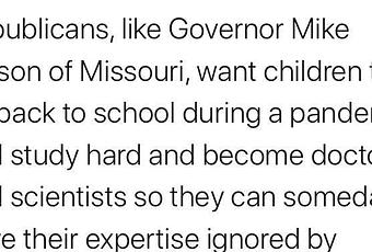 Image may contain: text that says 'Middle Age Riot @middleageriot Republicans, like Governor Mike Parson of Missouri, want children to go back to school during a pandemic and study hard and become doctors and scientists so they can someday have their expertise ignored by Republicans, like Governor Mike Parson of Missouri.'