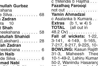 Former skipper Mohammed Nabi made a quick-fire 41 in 34 balls with 2 fours and 2 sixes. At one stage Afghanistan were 195 for 6 wickets but Sri Lankan bowlers fought back stronglytaking wickets at regular intervals to bowl them out for 228.