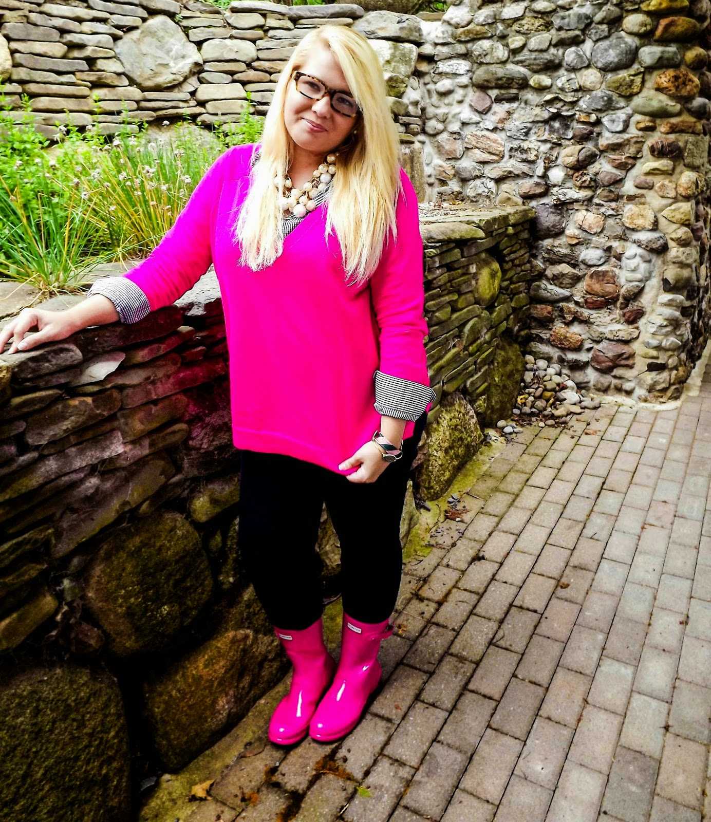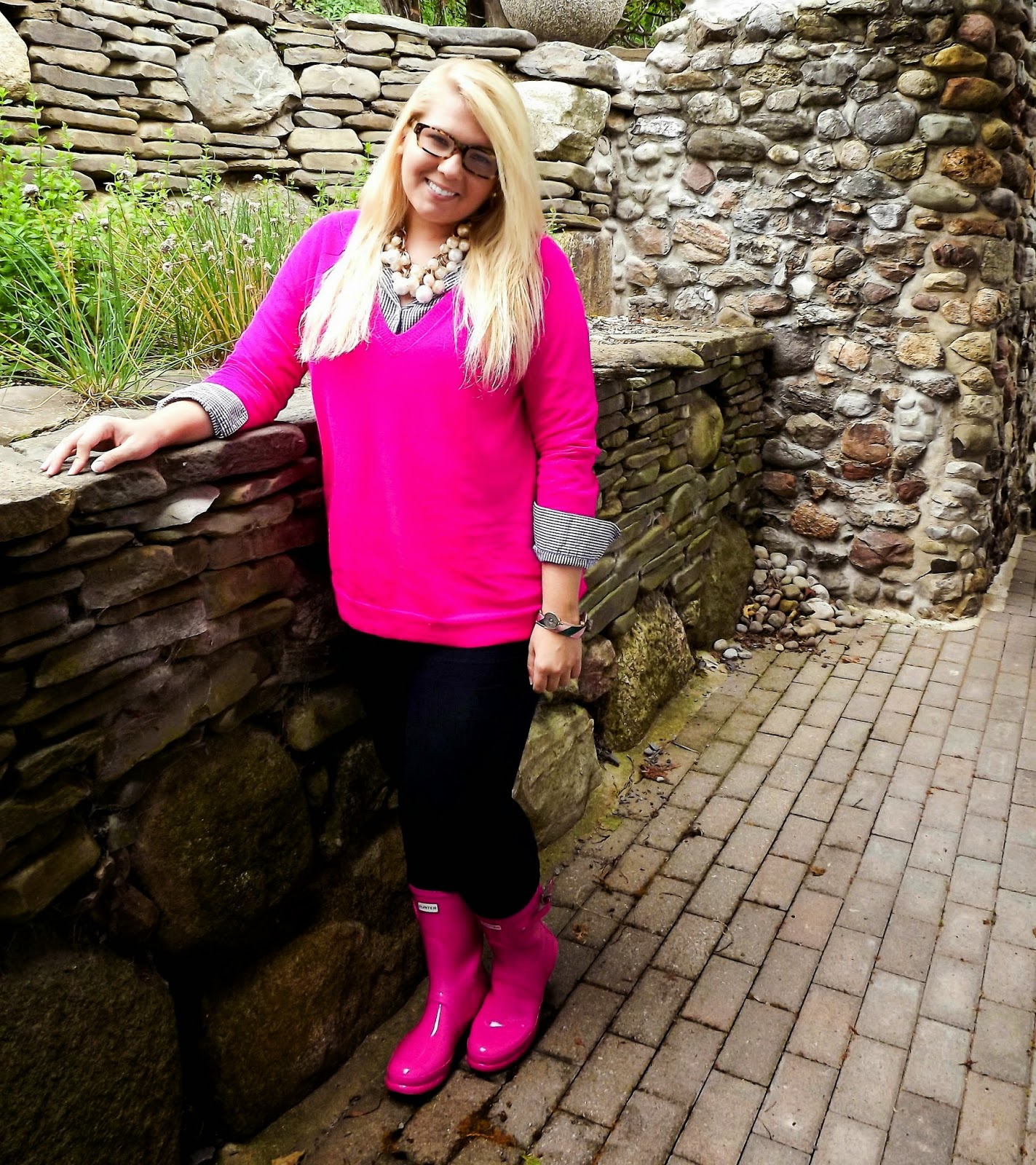 Outfit: Sweater- J.Crew, Oxford- Vineyard Vines, Jeans- Old Navy, Necklace- TJ Maxx, Boots- Hunter, Bracelet 1- Kiel James Patrick, Bracelet 2- Bourbon & Boweties, Glasses- EyeBobsMy little brother agreed to help me with my blog pictures and got a little artsy. For a 17 year old boy he did a pretty darn good job! The day started out drizzly and through out the day the rain was on and off. Between the storms, I talked him into being my mini photographer because I loved my layered look too much not to share. This sweater is one I picked up about a month and a half ago and haven't had a reason to wear it up until now. The color paired with the true navy gingham was a match made in heaven. And I'm pretty sure it was meant to be because of the fact that my hunters almost perfectly matched the color of the sweater. Honestly, all of these layers are making me completely ready for fall. Can we just talk about being able to layer with scarves and jackets already? Ugh I just want it to be here. Along with bonfires. I could use a nice bonfire right now. Couldn't you? I just want to roast marshmallows and listen to crazy country music and make memories with the best of friends. So if one of my friends could have a bon fire soon...that would be great. xoBCC