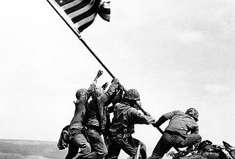 Raising the Flag on Iwo Jima is an iconic photograph of six United States Marines raising the U.S. flag atop Mount Suribachi during the Battle of Iwo Jima in the final stages of the Pacific War. The photograph, taken by Joe Rosenthal of the Associated Press on February 23, 1945, was first published in Sunday newspapers two days later and reprinted in thousands of publications. It was the only photograph to win the Pulitzer Prize for Photography in the same year as its publication, and was later used for the construction of the Marine Corps War Memorial in 1954, which was dedicated to honor all Marines who died in service since 1775.The flag raising occurred in the early afternoon, after the mountaintop was captured and a smaller flag was raised on top that morning. Three of the six Marines in the photograph—Sergeant Michael Strank, Corporal Harlon Block, and Private First Class Franklin Sousley—were killed in action during the battle; Block was identified as Sergeant Hank Hansen until January 1947 and Sousley was identified as PhM2c. John Bradley, USN, until June 2016.The Associated Press has relinquished its copyright to the photograph, placing it in the public domain.