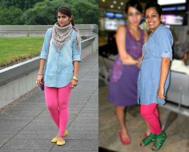 Just the other day, I came across this outfit of yours and the moment I saw it, I was like, 'Oh wow! That's EXACTLY how I had worn my denim shirt-dress once! Great minds do think alike!' So here's a picture to prove my point. A pair of hot pink tights sure work against the wash of denim, don't they? Only that I have on a gray necklace instead of a gray scarf, and green gladiators instead of yellow flats. But the essence of the outfits is so similar, no? I always knew we had a connection, even across the seven seas! :))Cheers!
