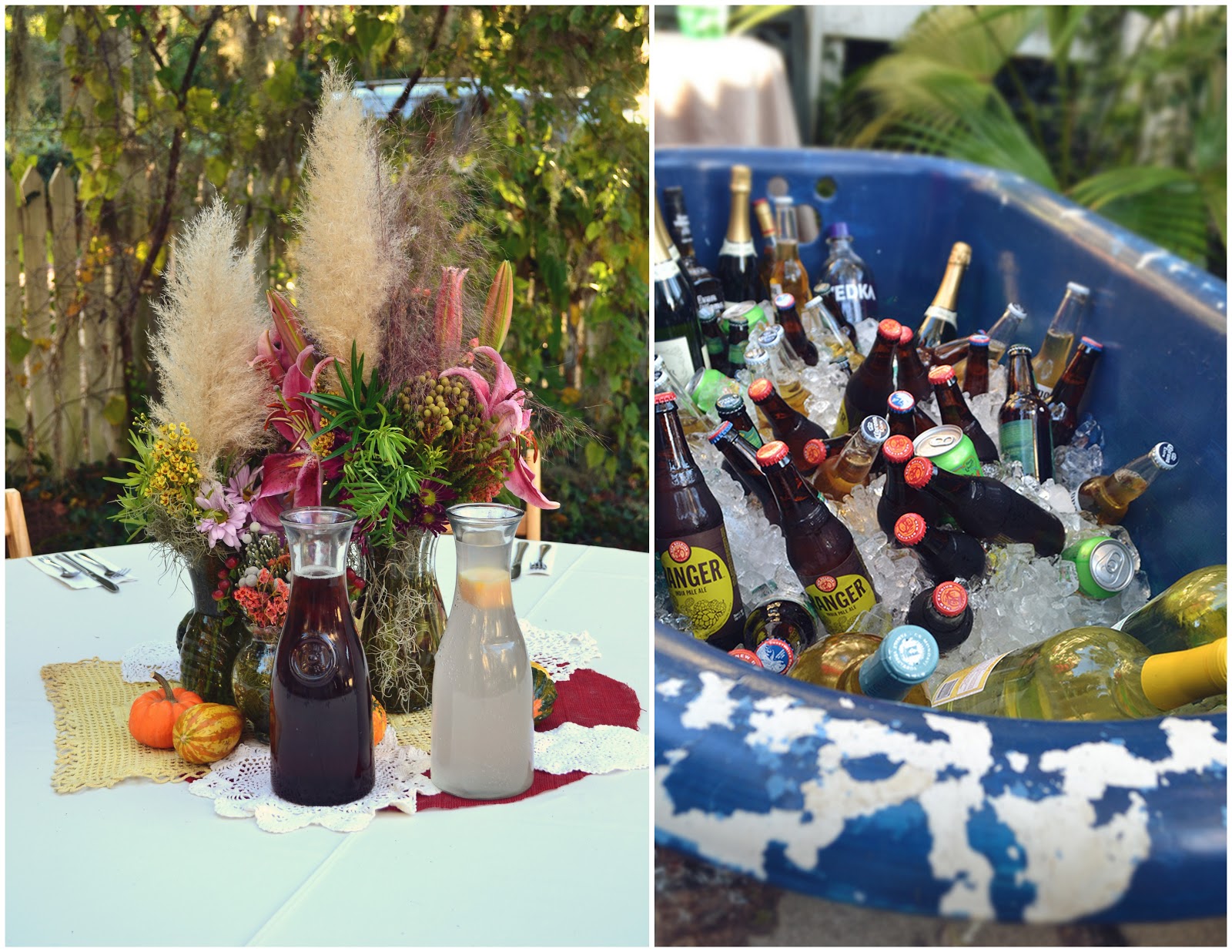 Eco-friendly details:flowers bought directly from wholesaler, flea market glass containers for flowers, flea market fabric which included retro pillowcases, guests all stayed at a vacation rental for the week and carpooled plus they had a full kitchen to eat there, totally organic and vegan reception food by caterer, vegan cake, and adorable DIY reception details.