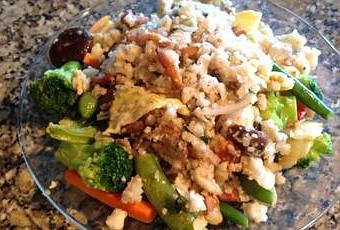 7) Stir in coconut aminos and vinegar, then top with scallions, cilantro, sliced egg and reserved bacon bits.