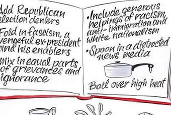 Recipe For A Second Coup Political Cartoon is by Ann Telnaes in The Washington Post.