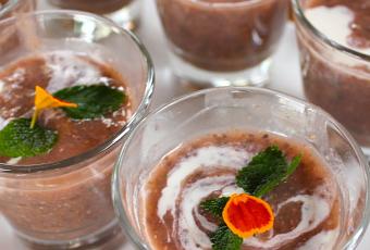 2. Spoon into suitable glasses and top with a 5 mm layer of cashew and coconut cream. Refrigerate until required and garnish with sliced strawberries, mint and a sprinkle of a few chia seeds (alternatively, you can just mix the coconut milk straight into the fruit mousse).