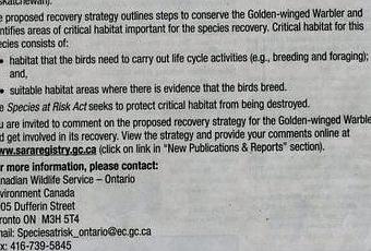 Environment Canada of the Canadian Wildlife Service has called for comments on their proposed recovery strategy for the threatened Golden-winged Warbler. The public notice with contact information are in the image below. Follow the link and look under December 31, 2014.