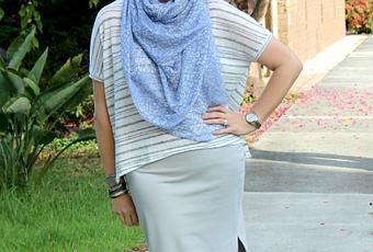There are heaps of ways to tie long rectangular scarves, many are more suited to winter weight scarves. These days there are so many huge summer weight rectangular scarves but tying them can prove kind of tricky. This way of tying works well with a larger scarf that you may find overwhelms your frame a little as you can tie it tighter or loser. Not ideal for a really hot day but good for spring and autumn when it’s not too hot!