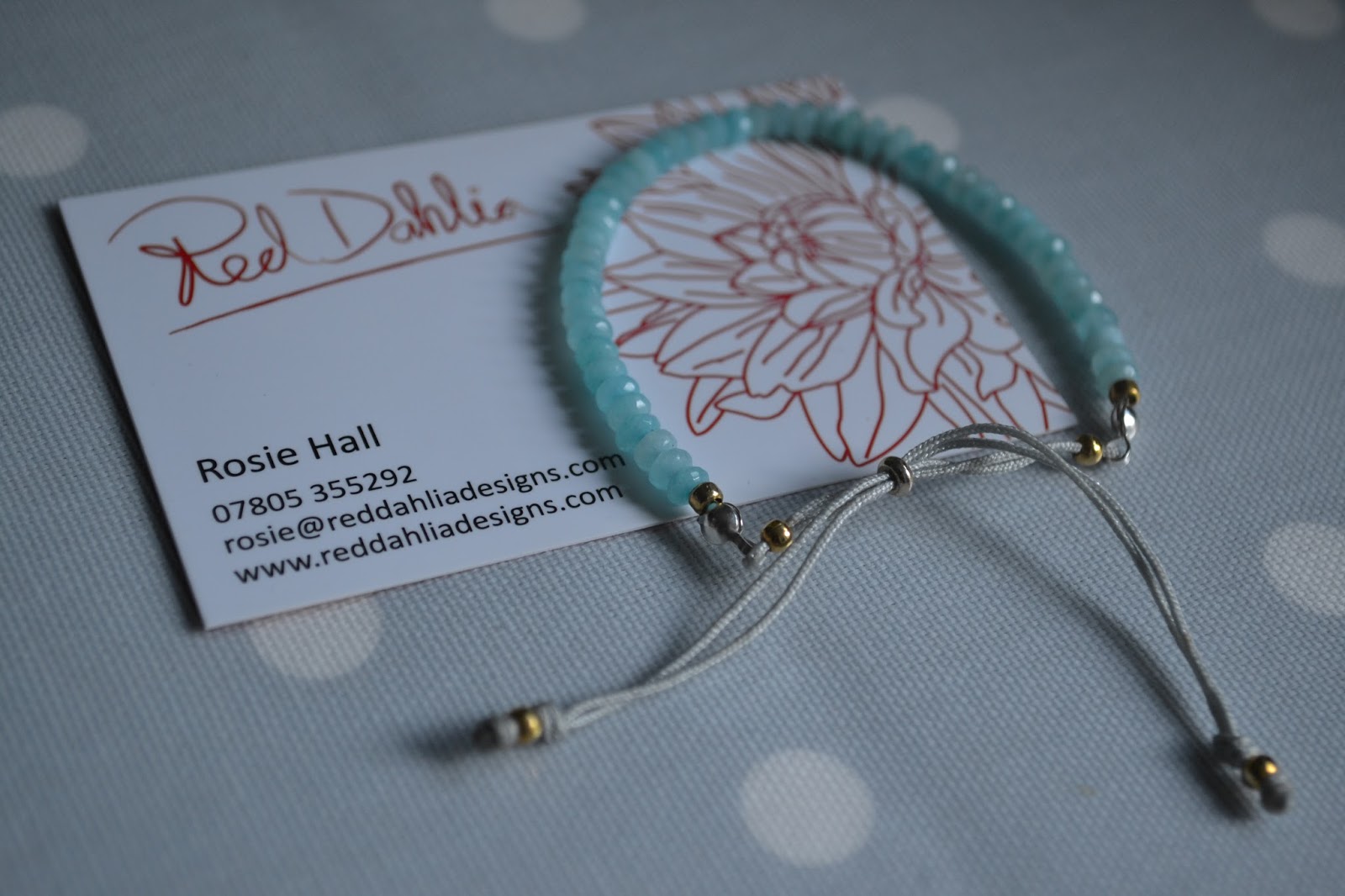 Rosie launched Red Dahlia Designs in February this year, which is a UK based creative outlet where she designs and makes affordable fashion jewelry for all ages. The range includes earrings, bracelets and necklaces. Rosie very kindly offered to send me one of her beautiful pieces of handmade jewelry to try out. The piece Rosie sent me arrived neatly wrapped in tissue paper and packaged in a pretty little organic cotton drawstring bag, as do all of Red Dahlia Designs items. I was sent the stunning Luxurious gemstone friendship bracelet, a delicate bracelet in a gorgeous aqua blue color. The bracelet is handmade using Agate Gemstone, Silver and Gold Plated beads on a Nylon cord with a simple ajustable fastening. I have rather narrow, childlike wrists (sadly, that's the only waif like bit) and usually have to have links removed from watches and bracelets resized so an adjustable slider is the perfect option on a bracelet. The bracelet looks extremely delicate, so much so, I was worried I'd snap it the first time I used it (I'm not the most graceful woman in the world) BUT, I've hardly taken it off my wrist (only to wash and sleep) since it arrived and it's been perfectly fine. It's obviously well made and clearly able to endure the life of Cat! The bracelet is the ideal width for me, it doesn't swamp my wrist, but it's thick enough to make an impact.Rosie has recently stepped into the wonderful world of Etsy, opening her Red Dahlia Designs Etsy Store where you can currently save 20% on all the products listed, you just need to enter 20LAUNCH at the check out to receive the reduction on your order.
