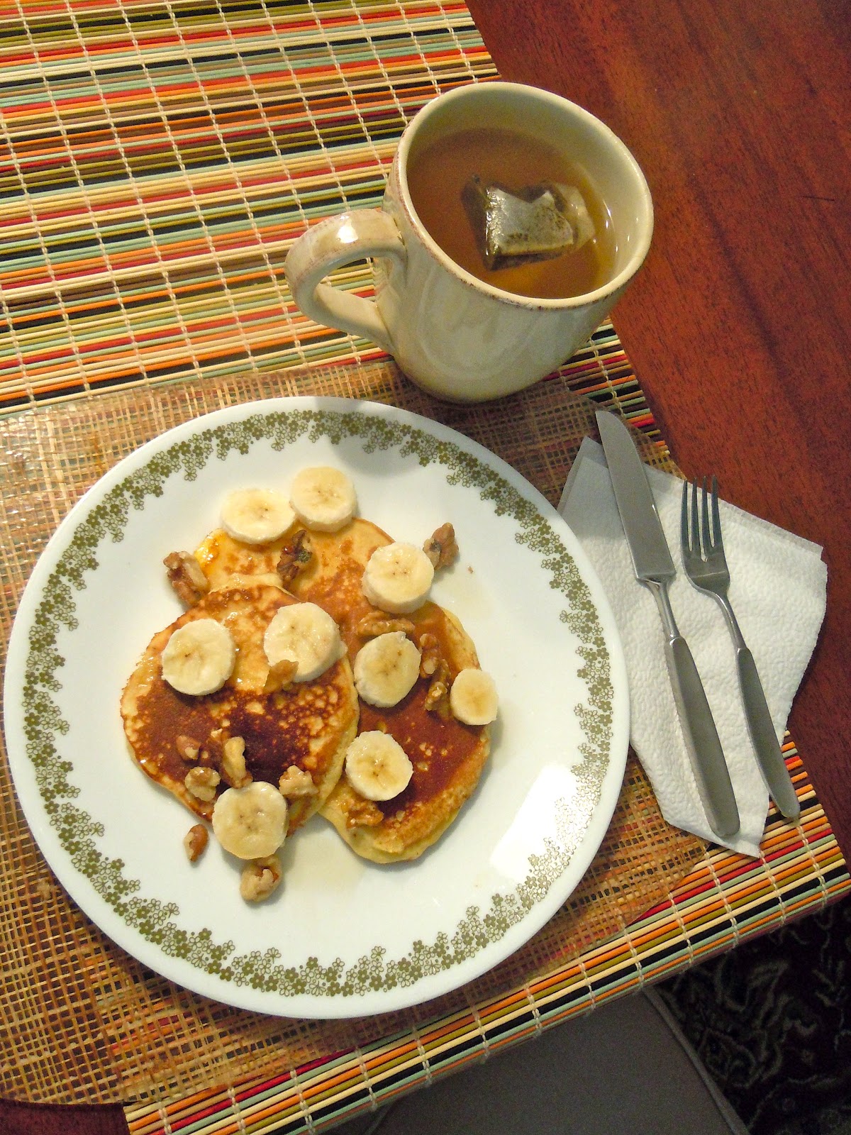 [Breakfast: pancakes with banana and walnuts, green tea]