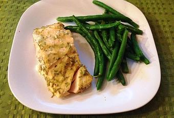 Sunday night, my loving hubby grilled me some delicious grilled salmon. I whipped up an easy coating of 1 tsp lemon juice, 1 tsp spicy mustard, 1 tsp olive oil, and 1 tsp rosemary. Paired with fresh green beans, it was just perfect. Plus, I had an extra piece of salmon left over for lunch.