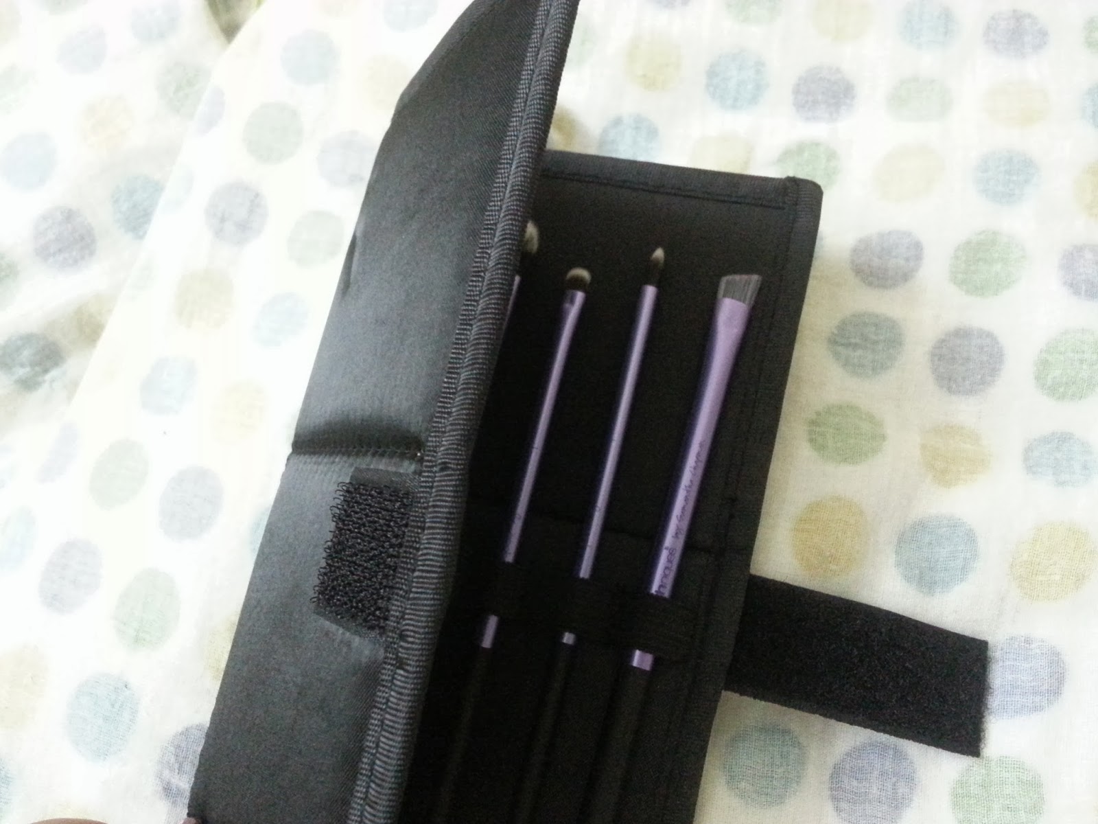 This set has 5 different eye makeup brushes. Each of these brushes are very thoughtfully designed to be in this set. It comes in a case that doubles for a stand. While you are not using the brushes the set will be a humble case folder with elastic loops made to fix the brushes but when you are using them simply fold the case horizontally and pull the thread that holds the ends. Fasten with the button like thing at the end of the rope. Well something like this.