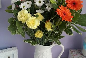 The flowers consisted of orange germini, orange lilies, yellow carnations and a lot of foliage. Orange flowers arent something I'd normally go for, Im more of a pink/pastel kinda girl when it comes to flowers, but these soon grew on me looking pretty in my hallway.
