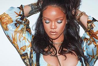 Rihanna was dressed in Versace during a promotional snap for her Fenty Beauty Galaxy collection.