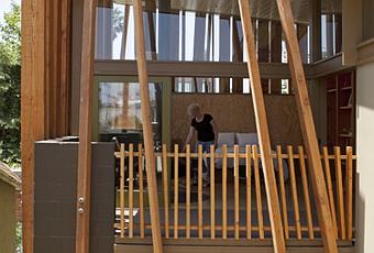 So each piece is structural. Thirty-four 4"x12"s cantilever out of the masonry wall in the garage and they bear the vertical gravity load and the lateral earthquake load. They must be 18 or 20 feet long and though we've arranged them a bit to offer shading inside, they're not decorative.