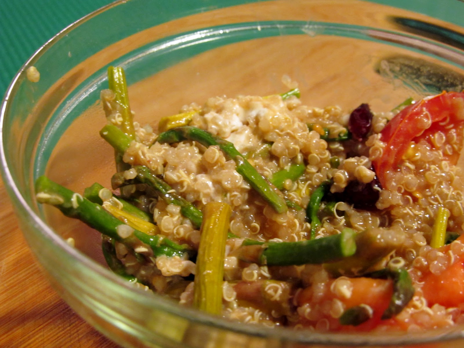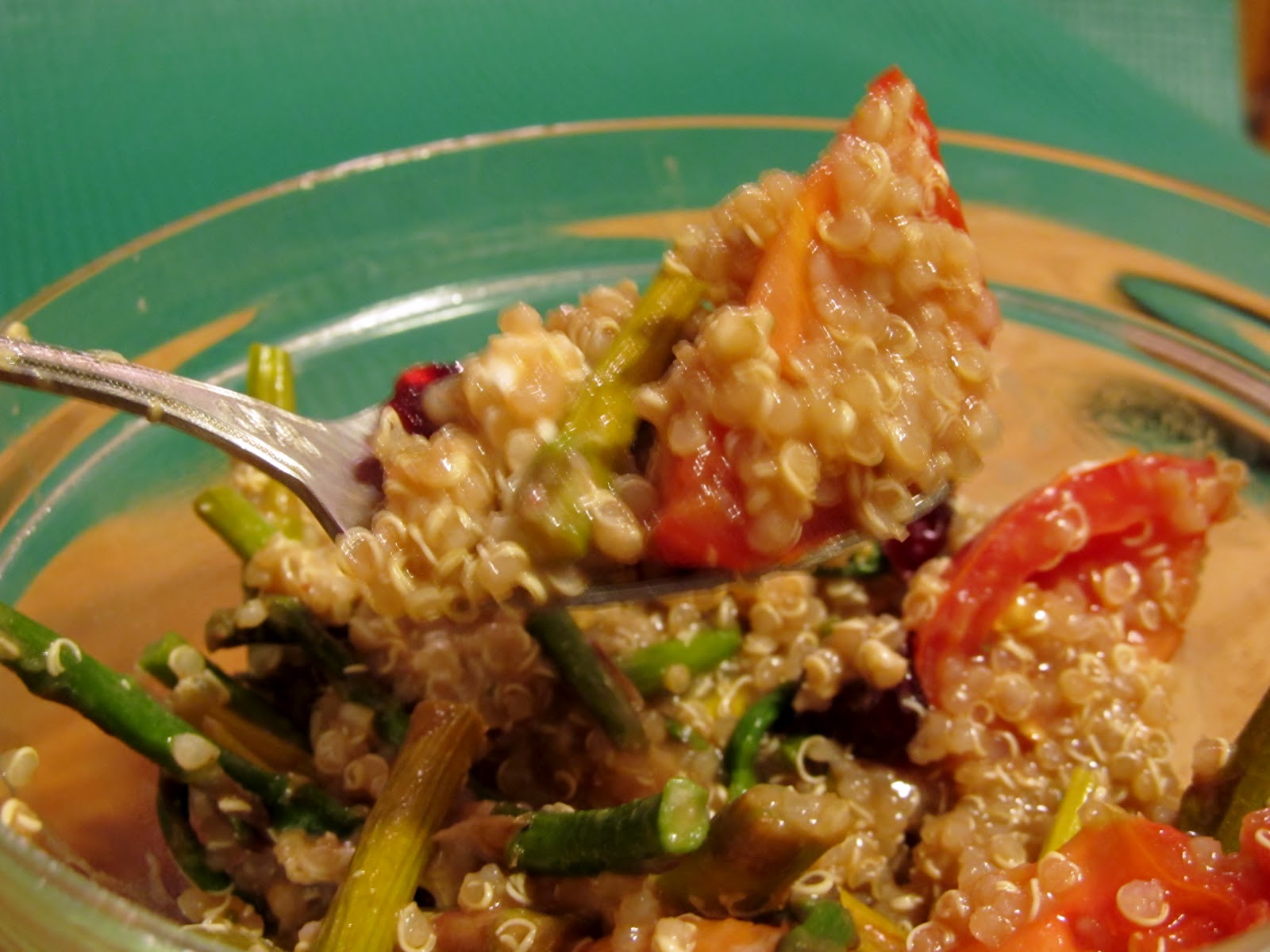 Combine the cooked, now fluffy quinoa with the asparagus, tomatoes, goat cheese, and cranberries in a bowl. And mix together the dressing of reduced balsamic vinegar, olive oil, and sea salt. Dump it over the veggies and voila! it's done.