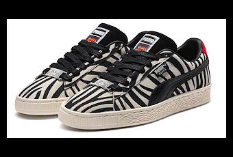 An eccentric shoe can sometimes seem a bit too over that top but that's not the case here. Puma has a winner with the Paul Stanley of KISS remix of their iconic Suede Sneaker. The upper is classic slick zebra print on crisp suede with a leather PUMA Formstrip. The heel panel is a vibrant bright red, a perfect contrast to the graphic back and white. This is such a cool pair to own and rock on days when you just want to chill or bring out your inner rocker. Available now at Puma.com.