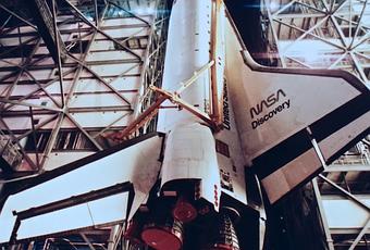 Space Shuttle Discovery is seen here inside the massive Vehicle Assembly Building, being hoisted as part of stacking operations to mate the Shuttle with the External Tank prior to the April 1990 launch of STS-31 which carried the Hubble Space Telescope into orbit. Of all the Space Shuttles built, the Discovery has to be my favorite. Not only is it the Shuttle that carried the Hubble into orbit, it is also the only Space Shuttle I had the privilege to climb into while I was working on the HST program. Entering service in 1984, Discovery was the third Space Shuttle orbiter vehicle to fly in space. Discovery flew 39 missions, spent a total of 365 days in space, and traveled almost 150 million miles–more than the other orbiters. It brought 184 men and women into space and back, for a record-setting total crew count of 251. Discovery is now displayed at the Smithsonian as intact as possible as it last flew in 2011 on the 133rd Space Shuttle mission. NASA transferred Discovery to the Smithsonian in April 2012 after a delivery flight over the nation’s capital. Olympus OM-1 w/Vivitar 28-85mm.