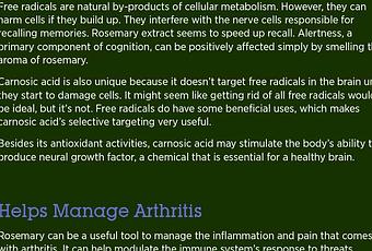Free radicals are natural by-products of cellular metabolism. However, they can harm cells if they build up. They interfere with the nerve cells responsible for recalling memories. Rosemary extract seems to speed up recall. Alertness, a primary component of cognition, can be positively affected simply by smelling the aroma of rosemary (x).
