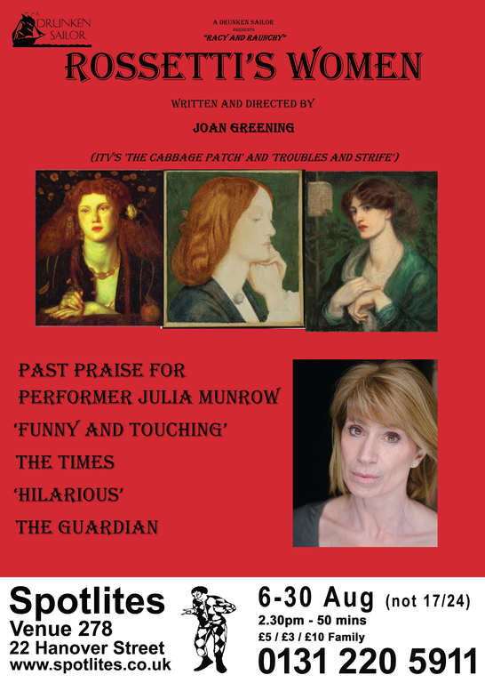 As you will know if you follow my work, I am very Fanny-centric. Imagine my delight, fair reader, when I discovered there was a play about Fanny Cornforth, using her to view the life and work of Dante Gabriel Rossetti and the circle of women that inspired his art and filled his love life. Not only that, the same actress, Julia Munrow, plays all the roles of Fanny, Elizabeth Siddal and Jane Morris. How could I resist? I got in contact with the playwright Joan Greening to ask her more... Q. When and where did you first experience the Pre-Raphaelites? I have been interested in art from a young age and I feel I have always been aware of the Pre-Raphaelites. I think it was originally Millais' Ophelia which made me take notice of the Pre-Raphaelites as I am also a Shakespeare fan. Once I had noticed the Brotherhood, I began to search out their paintings and became intrigued by their technique and obvious love of nature. I then discovered their personal lives was became fascinated with them all. I particularly like how they all inter-connect as a group. Q. What drew you to Rossetti? I wanted to write a one woman show for Julia who is an astoundingly good actress. I thought that a number of characters played by the same person would be different and intriguing. My thoughts then went to Rossetti who had a number of women in his life and his appalling treatment of Elizabeth Siddal. I could see a play that surrounded him, made him an awful/appealing off stage character and would give Julia enormous scope for her talent. Q. Similarly, what drew you to Fanny Cornforth? I chose to tell the story from Fanny's perspective because I have always liked her feisty character. I also believe she was devoted to him and he spoke about her at the end of his life. I find that very touching and heart breaking that she wasn't allowed to see him. Q. What do you want people to take away from your play in terms of the dynamic between the painter and his muses? I simply want people to enjoy the play and laugh and cry with Fanny. She has some very funny lines but the thrust of the play is very sad. The play suggests that Rossetti was a charismatic man who needed women to be his muses but was incapable of being faithful. Such was his appeal that women loved him no matter how he treated them. Q. What do you make of any of the other plays/films/tv based on the Pre-Raphaelites and their love lives? Why do you think we find it so fascinating and focus so much on this aspect? I have seen was the recent t.v. series which I thought was great fun but historically inaccurate and I particularly objected to the portrayal of Edward Burne-Jones and William Morris. Rossetti was believable although far too good looking! I also saw the film Effie which I thought was very dull. A non-consummated marriage is a riveting subject but somehow the film never came to life. Each of the Pre-Raphaelites had a very interesting love-life. There were so many scandals in such a straight laced age. Complicated love lives are always far more interesting to write about than an ordinary marriage! Before the play, I knew nothing about Fanny. I knew about Lizzie Siddal and had seen some of the TV series - but wasn't aware of Fanny's existence. Q. What's it like playing all three muses? It is a fantastic opportunity for an actress to stretch herself but by playing three totally different characters, particularly having to transform yourself in an instant from one to another without the help of costume or lighting changes. It is very physically and emotionally demanding. It is a gift for any actress. Q. How did you prepare for the part? Joan made me aware of many of the historical aspects of the three characters and to be honest it is all there in the play so it was a matter of emotionally connecting with the parts that were written. Q. If you could go back and give Fanny one piece of advice, what would it be? I think Fanny could give me some advice because she manages the balance between heart and head. Although she clearly loved Rossetti she didn't allow disappointments in love to overwhelm her. She also seemed to have a very sound financial sense and made sure she provided for herself in old age. I also love the way she throws herself into life. Q. What's your favorite Fanny picture? My favorite painting of Fanny is Lady Lilith. Thanks to Joan and Julia for giving me their time and my very best wishes for the play. For more details on Joan's work look on her website here. Rossetti's Women opens 6 August at Venue 278 in Edinburgh, and for tickets call 0131 220 5911. I look forward to hearing further venues and will of course let you know as I'd certainly love to see Julia bring my heroine to life!
