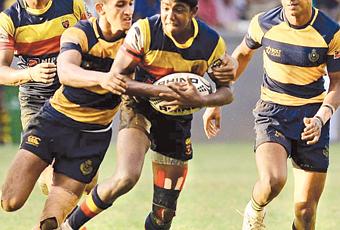 A Trinity player is well tackled by Royalist Philio Calyaneratne