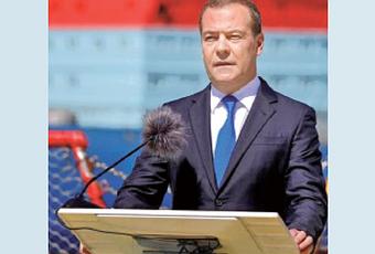 Deputy Chairman of Russia’s Security Council Dmitry Medvedev delivers a speech during a ceremony marking Shipbuilder’s Day in Saint Petersburg, Russia.