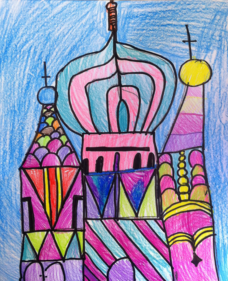 St. Basil’s is a famous cathedral in Russia, which was originally designed as a cluster of chapels. It’s unique architecture manages to look both old and new at the same time. 1. For this lesson, I led the students in setting up their basic building shapes, but then gave them THIS color photo for a guide. Starting with letter size paper, they drew a large rectangle in the middle. An “onion” shape was added on top.2. A somewhat shorter rectangle is attached to the left and right. A curved top with ball is added.3. Now the fun part – lots of curves and angles and swirls are added to decorate the entire building.4. When the drawing is complete, all the lines are traced with a black Sharpie marker and the shapes are colored in with crayon.Thanks so much to Keana A., a 1st grader who let me share her drawing. Can you tell she comes from an artistic family?