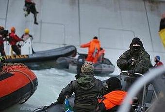 “It didn’t take long to reach the platform and when I did, two of the climbers had already managed to get a line up so we could start our ascent. Before I had a chance to scale the platform, two boats headed towards us from the Coast Guard vessel, with people wearing military camouflage clothing and balaclavas. It felt like I was living through a horror movie as they rammed into us.”