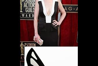 Michelle Dockery, best known as Lady Mary Crawley on Downton Abbey, wears the Gianvito Rossi Alina Pump, from the Fall 2013 Collection, with her monochrome, tuxedo-inspired, J.Mendel dress to the 20th Annual SAG Awards. The hand-finished, black and white, suede and leather pump features a pointed toe, white leather inserts, tonal stitching, and a 4" heel, which paired perfectly with her black and white red carpet look. Designer, Gianvito Rossi is known for adding geometric and color blocking details to his collection and we love several styles from fall 2013 and his spring 2014 collections.