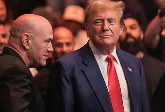 Donald Trump standing next to UFC president Dana White, left, at Saturday night’s UFC event in Newark, N.J. (AP Photo/Frank Franklin II)
