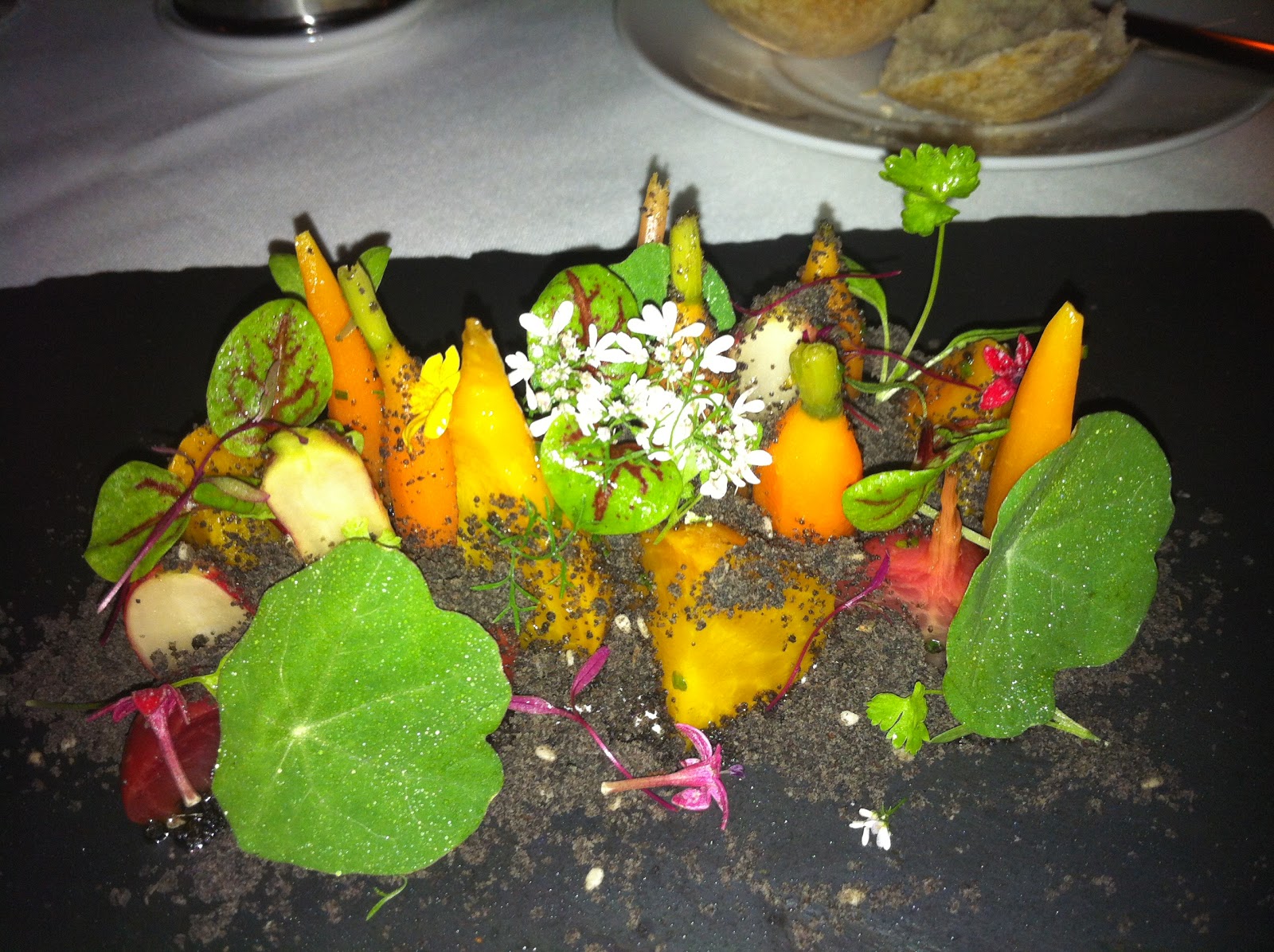 Next was the salad of farm vegetables, edible dirt, and creamy goat cheese. This was possibly the winner in terms of presentation, and I loved the creativity (I’d never think of including dirt, but this worked)!