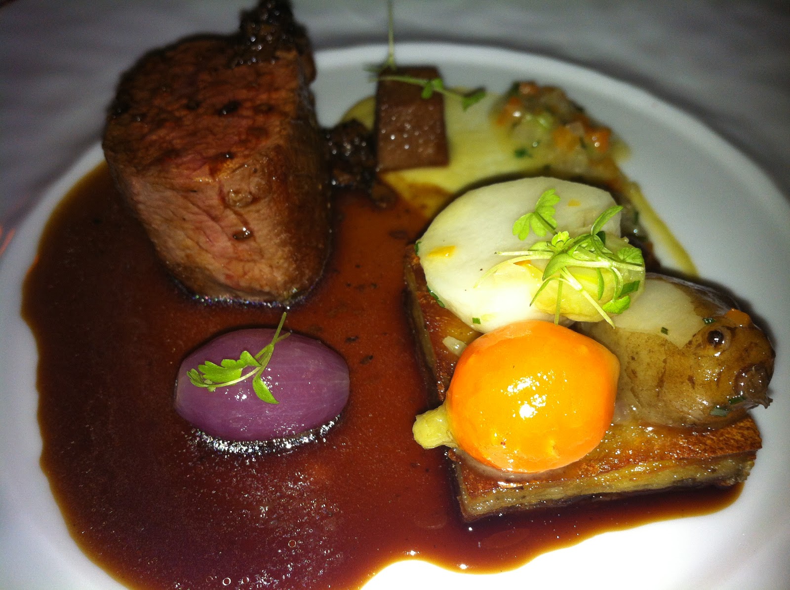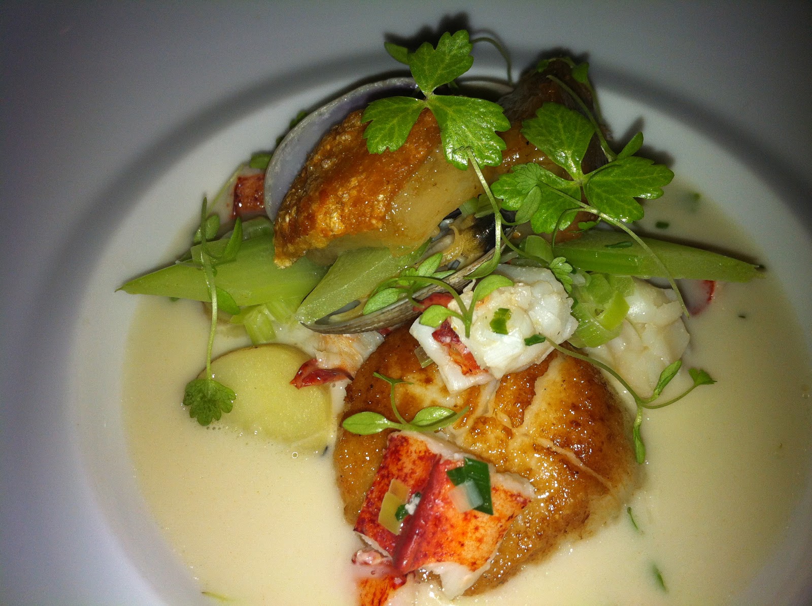 Our third course was the scallops, which came with poached lobster, seared pork belly, and baby manila clams. The whole thing was served in a chowder sauce (a light creamy broth), and I loved the take on a classic New England style chowder.