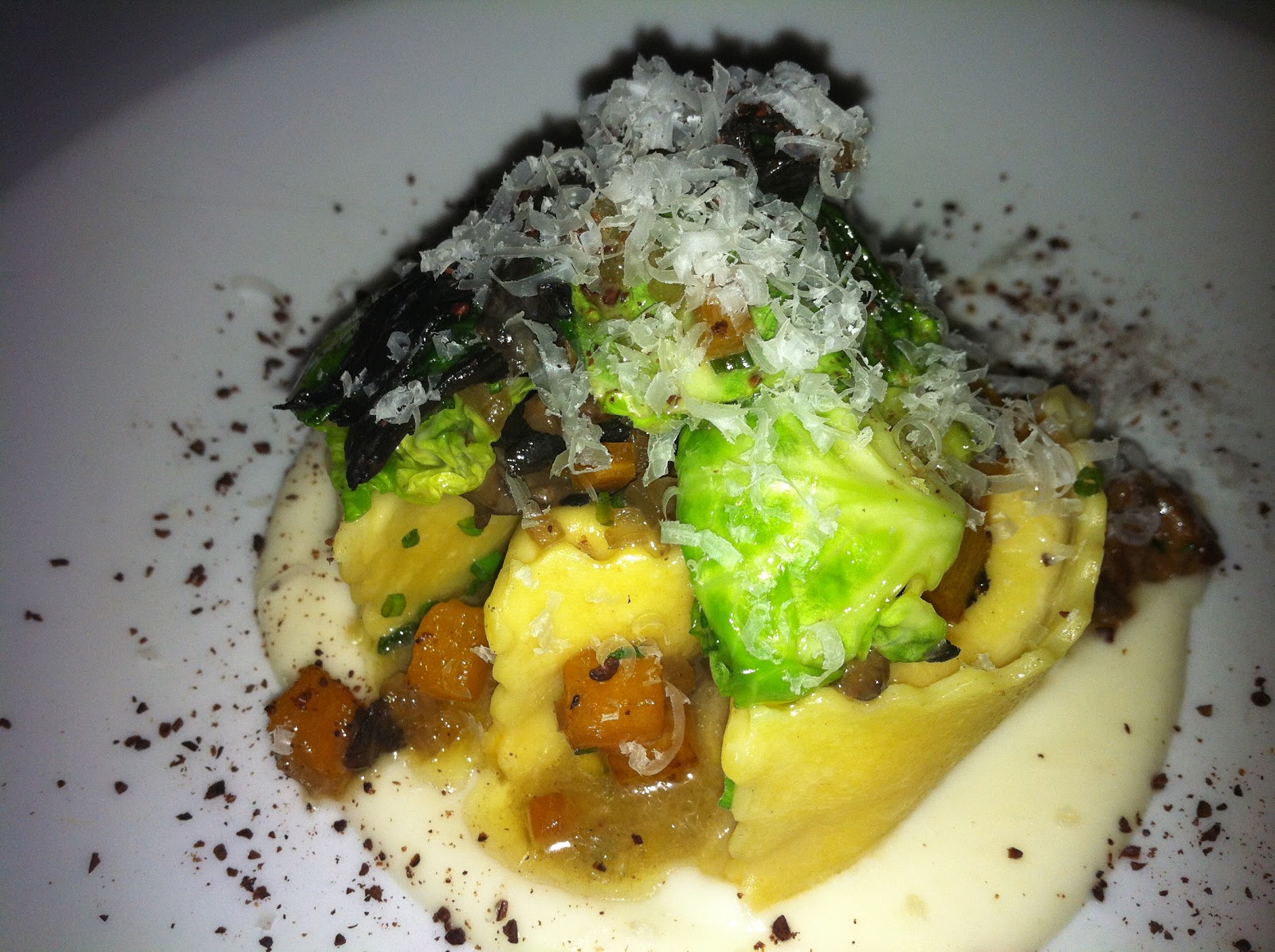 The next course was a sweet potato agnolotti served with brussels sprout leaves, celery route purée, locally foraged mushrooms, roasted cocoa bean, and shaved parmesan.