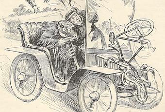 "Jove!" cries the motorist as an unfortunate cyclist crashes through his windscreen, "Might have killed us! I must have a wire screen fixed up."