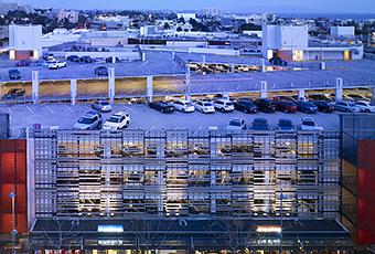 The façade of the Santa Monica Public Parking Structure by Brooks + Scarpa was designed from a single mass-produced and repeatable panel composed of a series of cement board slats formed into screen resembling lumber pallets. Arranged in a slightly different position relative to each adjacent panel, each is approximately 10 x 16 feet. The result? A visually striking and complex patterned design.