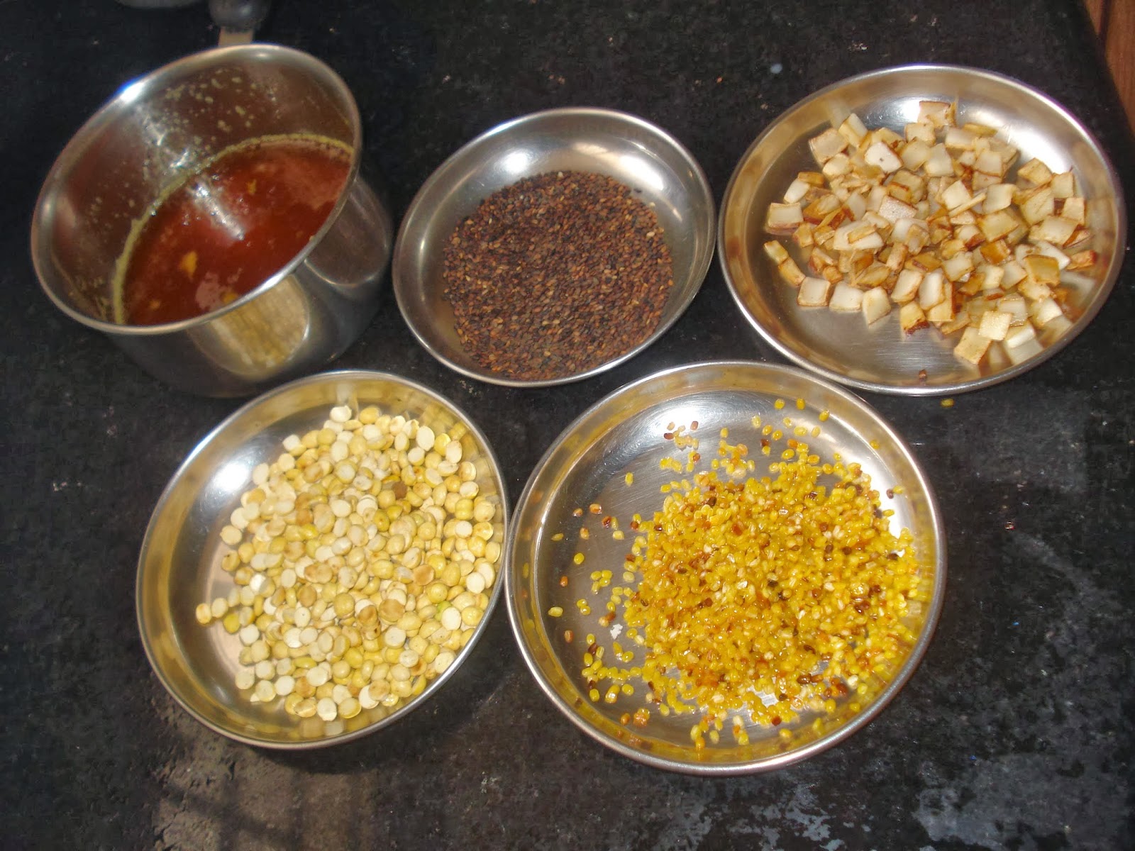 1. First we have to dry roast fried gram, moong dhal until a good smell comes (No need to wait for golden brown colour). Then dry roast the till seeds until it splutters.