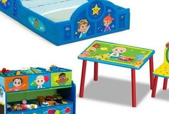 -- Set includes Sleep and Play Toddler Bed, 6 Bin Design and Store Toy Organizer and Table with Chair. All items in the set feature colorful graphics of kids' favorites.Available in CoComelon , Paw Patrol Encanto, Baby Shark, Batman, Spiderman, Micky Mouse, Minnie Mouse, and Frozen.