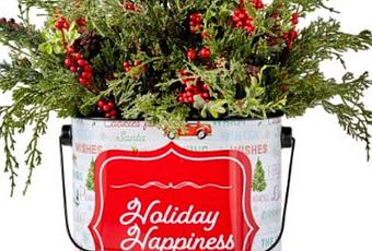 -- Featuring a festive mix of faux cypress leaves and red berries pouring out from an equally festive bucket planter that reads, "Holiday happiness," on the front, this artificial arrangement adds a delightful seasonal look to any space and a fresh, natural touch too.Now $15.00 (was $29.98)