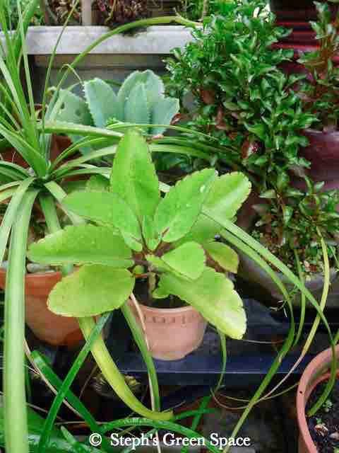 In the pic below, the plant that is in front, with bright green leaves, is Kalanchoe pinnata and the one at the back, in bluish green leaves, is Kalanchoe daigremontiana Itulehti. Both are thriving well in spite of the frequent afternoon rains. Yippie!!
