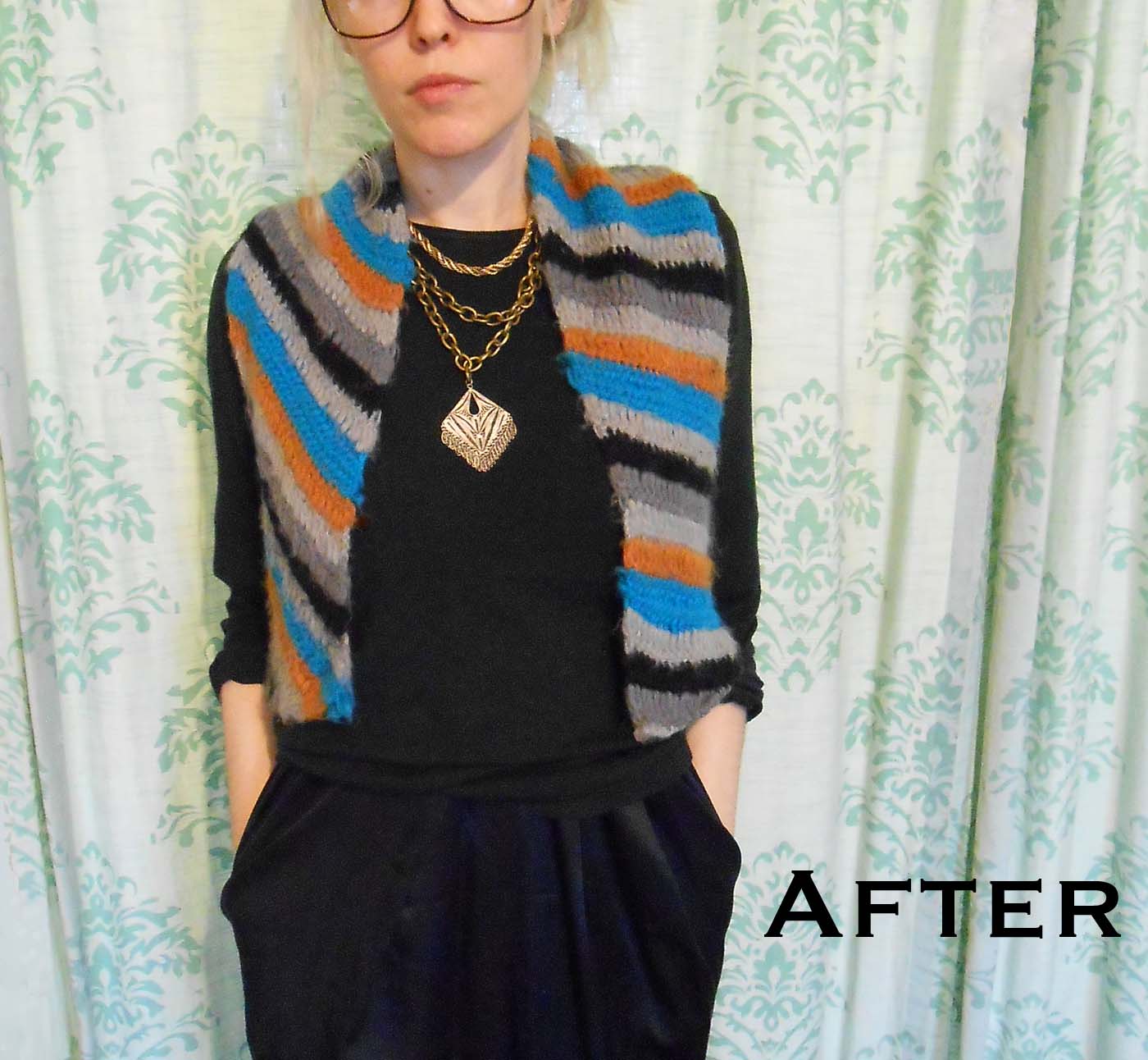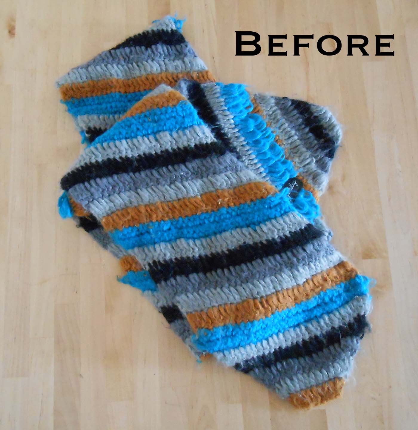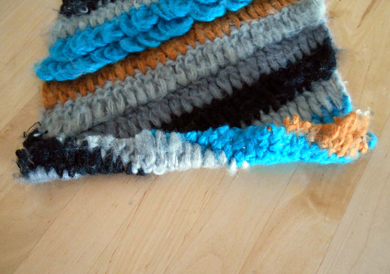 Step 8: Fold the long piece of scarf so the ends all meet up with the bottom of the smaller pieces and pin.