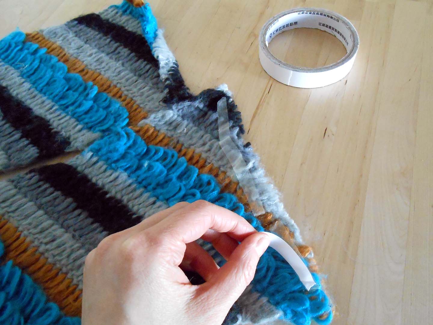 Step 8: Stitch across. Now is also a good time to stitch the edge on the long piece with the double stick tape on it.