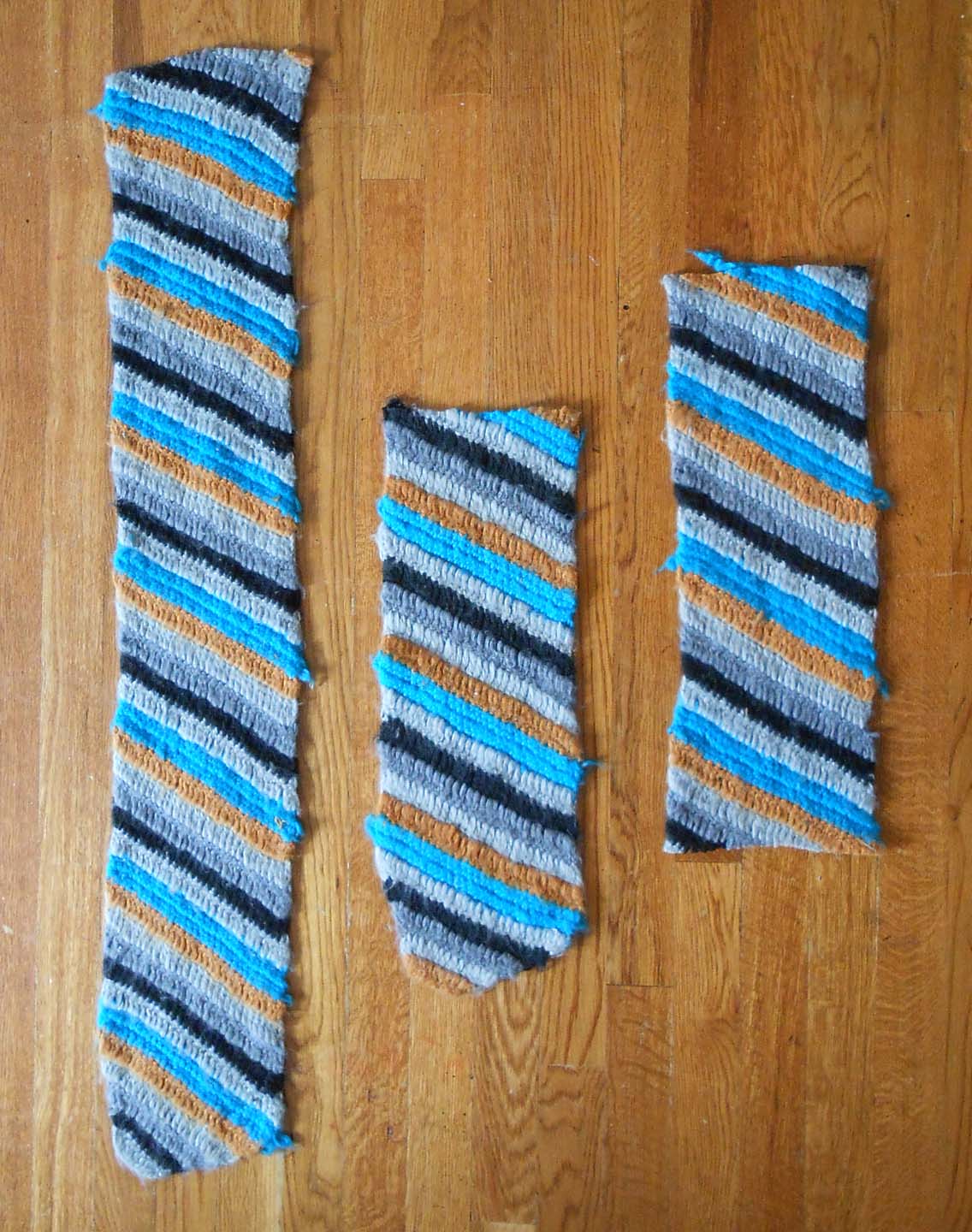 Step 8: Fold the long piece of scarf so the ends all meet up with the bottom of the smaller pieces and pin.