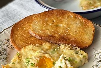 You cannot fault it. Fresh farmhouse eggs. Fresh soft white breadcrumbs. A good cheddar cheese. Finely minced spring onions, cream/milk. It doesn't get much simpler than this.