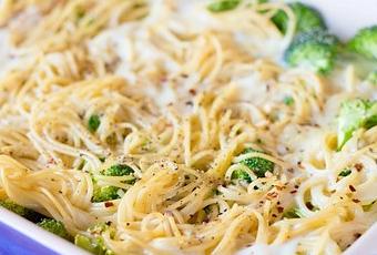Add spaghetti and broccoli to a greased pan or individual baking dishes. Pour enough eggs to fill the pan.