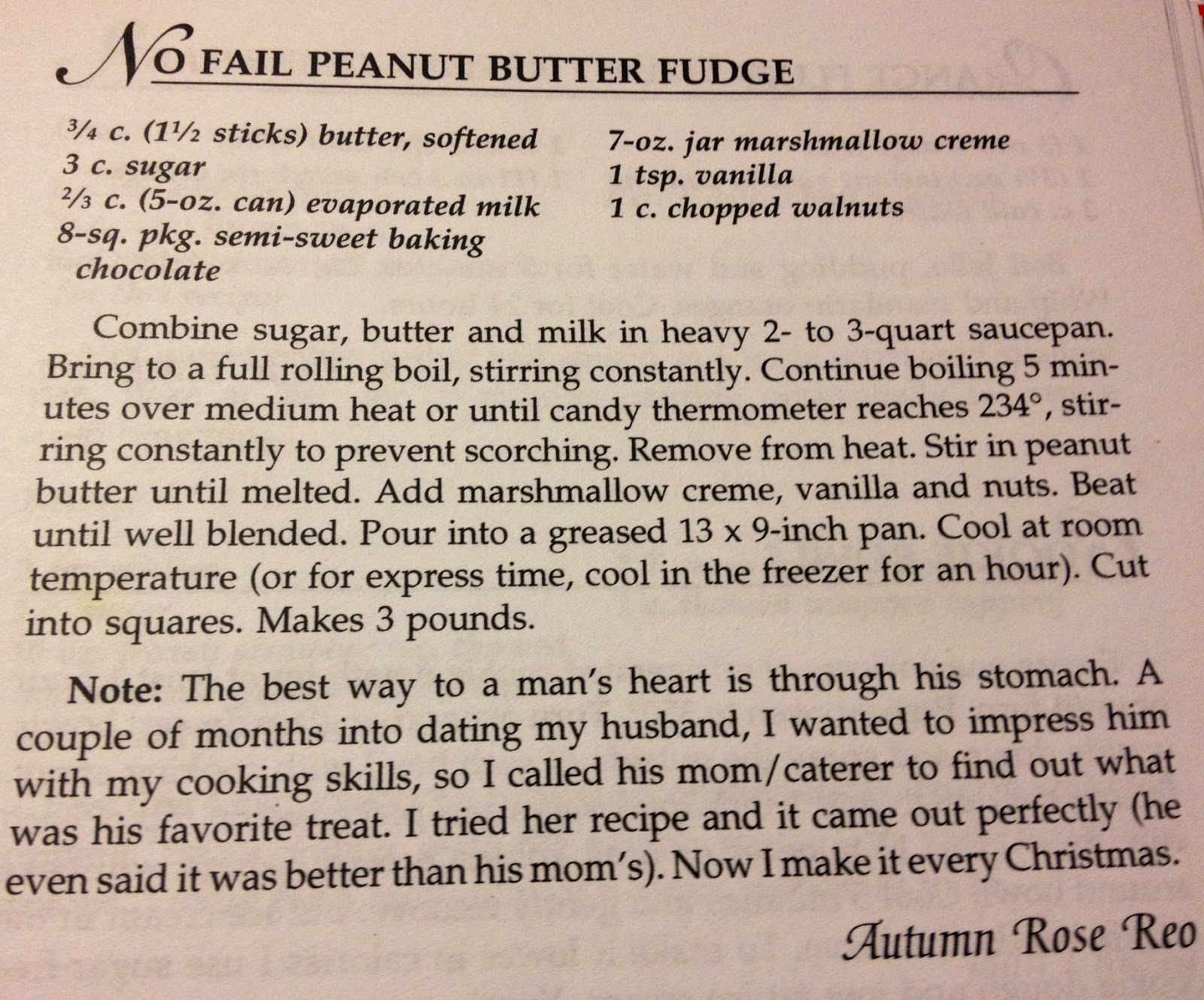 A holiday tradition in our home is the making of the Peanut Butter Fudge. I felt it was such a momentous occasion I even shared it with my Junior League anniversary cookbook a few years ago...too bad when I submitted the recipe, I forgot one ingredient. Can you guess what it was?
