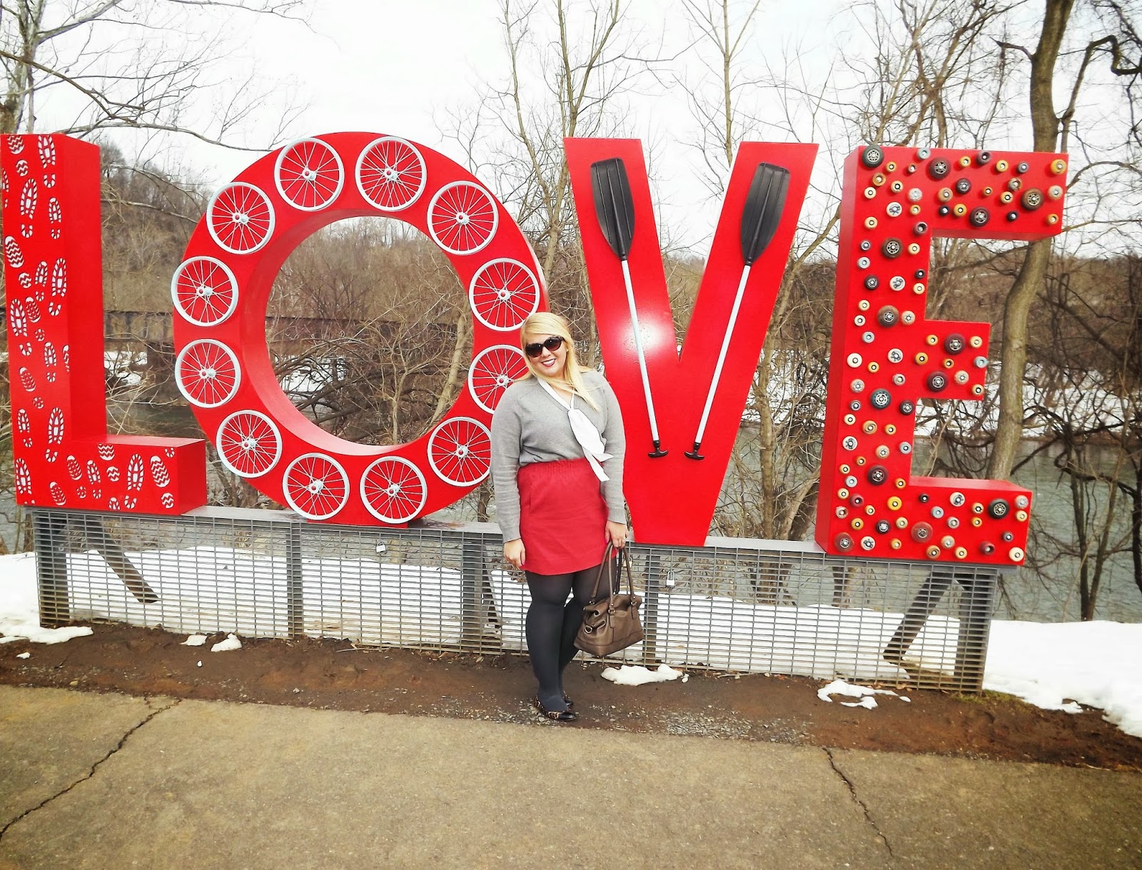 Outfit: Blouse- Lilly Pulitzer, Sweater- J.Crew, Skirt- J.Crew, Stockings- Old Navy, Flats- Michael Kors, Purse- Kate Spade, Sunnies- Betsey Johnson Post Bridal Expo, one of my best friends and I went downtown to do a little bit of exploring. As it is with other cities in VA, the LOVE sign is a huge attraction, reflecting the personality of the city & it's residents. It may have also perfectly matched my outfit. With red lips, a red skirt, & some fun in mind...it was the perfect place for a mini shoot. Does your city have a special place like this? I love discovering places that are city specific! xoBCC
