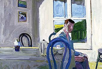 The model is taking a break in a blue robe, sitting in a chair, having a coffee. Perhaps he just put the robe on after holding a pose. Maybe the painting studio is next door. He's looking at us, but perhaps he's looking at the painter. I'm taken in by the colors, the model's stare, and the shapes: the lovely curves of the wood-bent chairs, and the squares of the window behind the sitter, forming a rectangle. I like the sun and I love the shadows, the creamy whites and blues. The brush strokes stun like perfect sentences. Artist Paul Wonner has let us in on this moment, as if it was the most natural thing, to stumble on a model, having a coffee, taking a break. And what does it mean not to have the painting that was painted in the studio, but this, a break from the "real work" that engages the viewer in a conversation, and an immediate search for narrative?