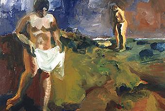 Two Bathers first struck me as a kind of dark vision with its deep hues, forceful brushstroke, and the two figures inhabiting the same landscape but belonging to seemingly different worlds. But on closer and repeated viewings, I began to see the work in terms of its beauty: as if Cezanne's bathers had traveled from Aix to the distinctive northern California landscape. The world is verdant and the sky is blue with a threat of red. Perhaps it's the relationship between the two bathers that holds the work together: a taut psychological landscape of isolation as well as of not being alone.