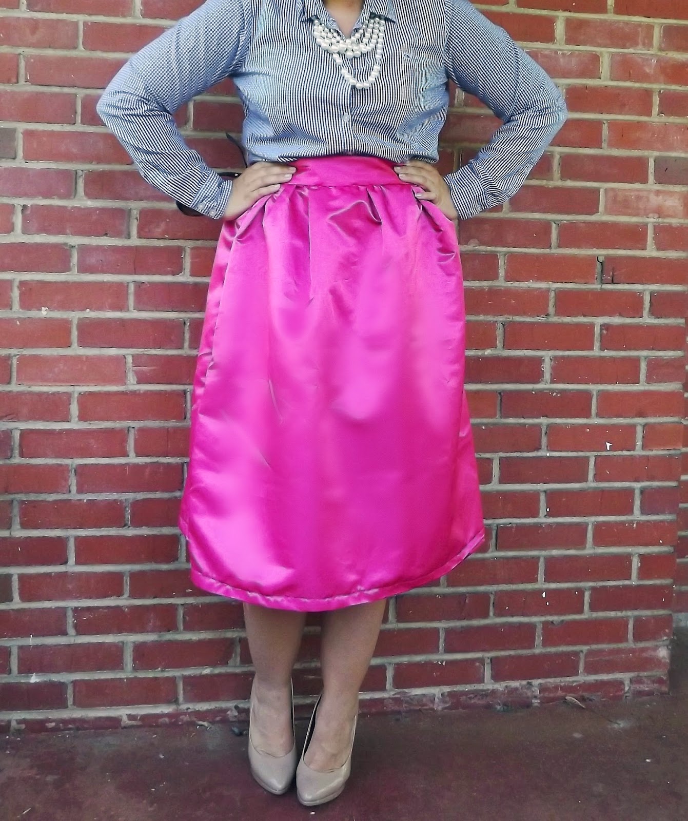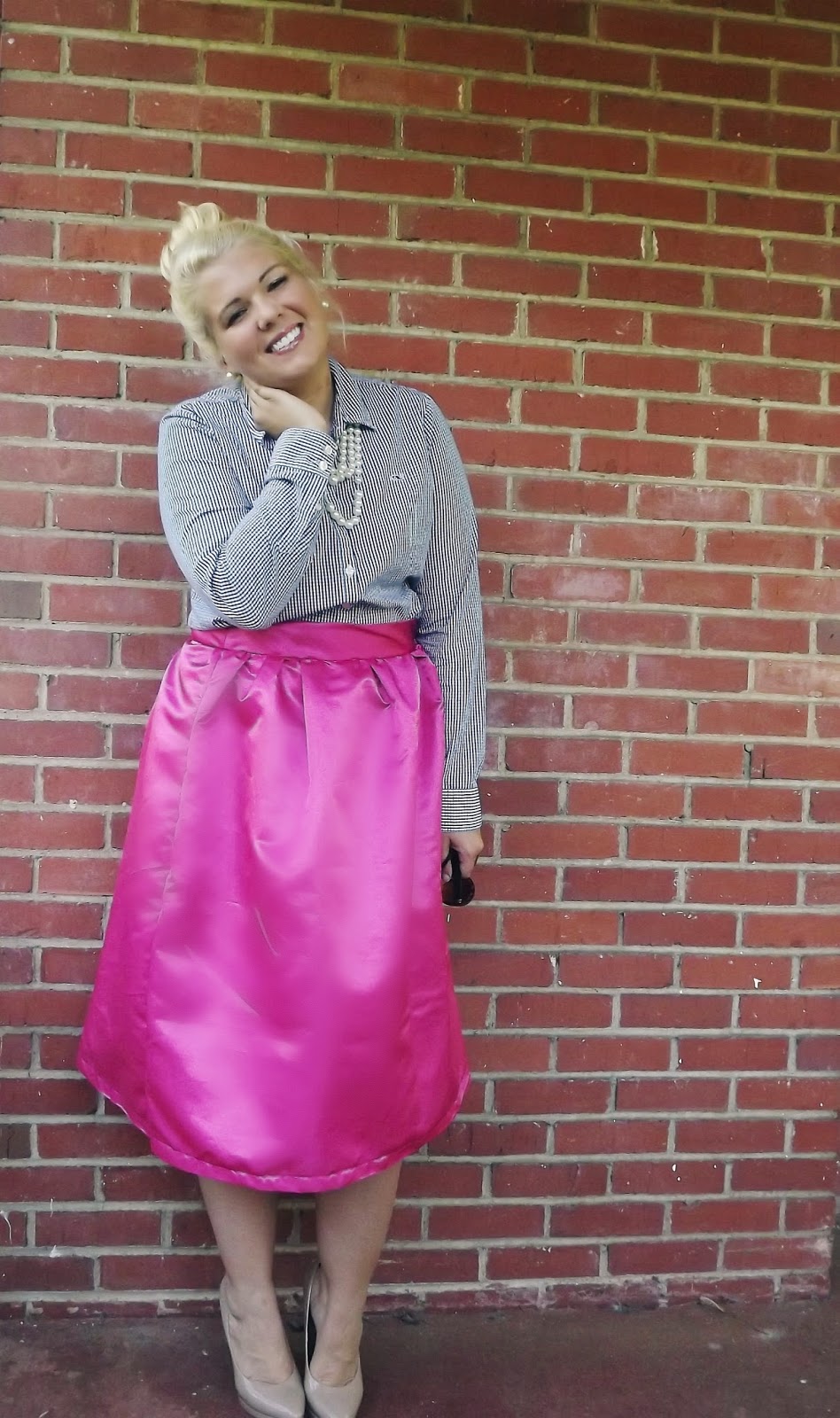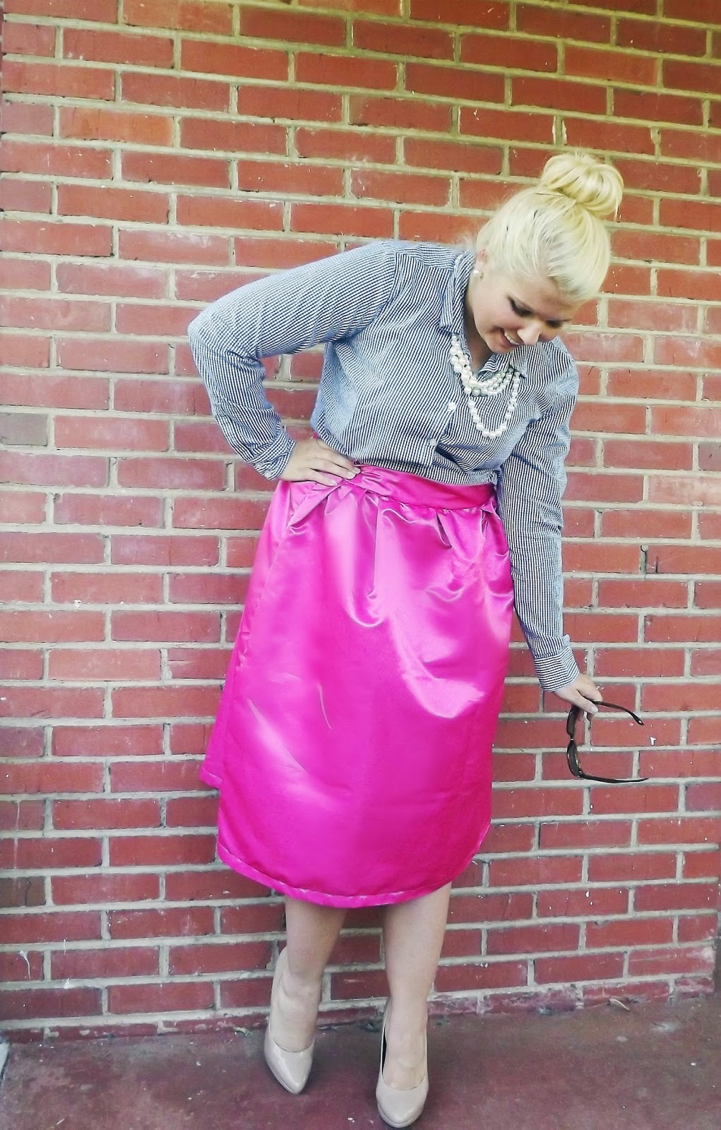 Outfit: Blouse- Vineyard Vines, Skirt- MADE BY ME, Heels- BCBGMaxazria, Sunnies- Betsey Johnson, Necklace- J.CrewOk y'all, after two months working on this skirt, it is finally done. Admittedly it turned out too big and I had to pin the back. My original measurements had changed (yay!) and I have to take it in. But the skirt itself was exactly what I wanted; a voluminous pink midi skirt!